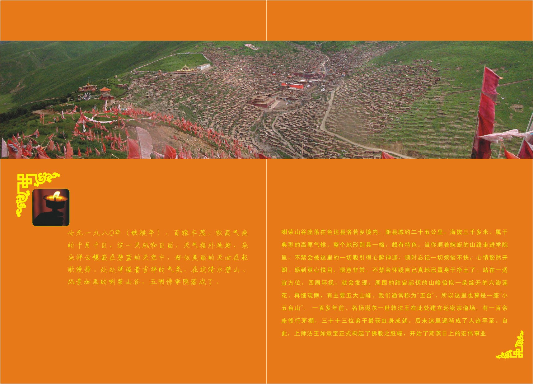 公元一九八零年(秋猴年),百稼丰茂,秋高气爽的十月十日,这一天风和日丽,天气格外地好,朵朵祥云镶嵌在碧蓝的天空中,好似美丽的天女在轻歌漫舞。处处洋溢着吉祥的气氛,在这青山碧水、风景如画的喇荣山谷,五明佛学院落成了。